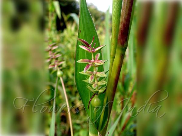 coarse, and stout, and 1-2 m high. Leaves 10-45 x 1-2.5 cm, linear-oblong, heart-shaped at base, margin scaberulous, tapering at tip; sheaths to 6 cm long, hairless; ligules ovate, membranous. Flower-spikes are 6-10 cm long, erect