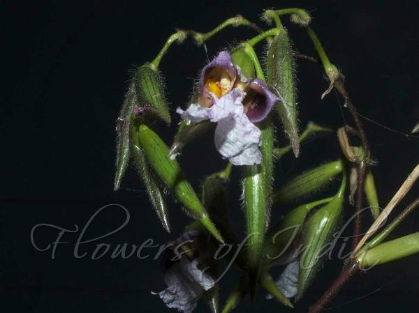 flowers are suspended from a zigzag-shaped inflorescence stalk. Small,