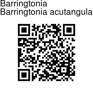 Barringtonia is an evergreen tree of moderate size, called by Sanskrit writers Hijja or Hijjala. The fruit is spoken of as Samudra-phala and Dhātriphala or ”nurse’s fruit,” and is one of the best known domestic remedies. Also called Stream Barringtonia or Itchy Tree (after a catepillar with irritant hairs that sometimes colonises the undersides of the leaves) Barringtonia is a tree 5-8 m tall with rough fissured dark grey bark. Leaves are obovate. Red flowers are produced on pendulous racemes about
