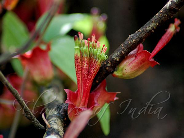 Bottle Mistletoe is a parasitic shrub, native to South-West India. Stem lenticillate. Leaves opposite, reddish when young, ovate, base rounded; leaf-stalk 0.5 cm long. Flowers are almost stalkless, sitting on woody stem, subtended by reddish, bell-shaped, 5-lobed, 2-3 cm long bract structure. Sepals are 5, triangular. Actual flower is inside the bell shaped bracts, 5-petalled, reddish; tube dilated above the middle. Stamens 5; filaments short; anthers linear, style erect; stigma capitate. Flowering: July-September.