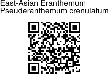East-Asian Eranthemum is a subshrub or shrub, up to 3 m tall. Flowers are borne in densely flowered thyrses 3-10 cm long. Flower are white or light purplish, 3.5-4.5 cm, outside finely and sparingly velvet-hairy with gland-tipped trichomes. Flower-tube is 2.5-3.5 cm; lower lip 3-lobed, lobes oblong and about 1 cm; upper lip 2-lobed to middle. Stamens are slightly protruding; filaments about 3 mm, hairless. Flower-stalks are 1-3 mm, velvet-hairy. Sepal-cup is 4-5 mm; sepals linear-lanceshaped, densely velvet-hairy. Bracts are triangular, about 7 x 3 mm, bracteoles subulate, 3-4 x about 1.5 mm, brown woolly. Stems are blackish brown, nearly round, velvet-hairy. Leaf-stalks are 1-4 cm, finely velvet-hairy; leaf blade ovate-elliptic to oblong-lanceshaped, 5-15 x 3-5.5 cm, below light green and velvet-hairy along veins, above slightly velvet-hairy, secondary veins about 7 on each side of midvein, base wedge-shaped, margin entire, tip pointed to tapering. Capsule is club-shaped, about 2.5 cm. East-Asian Eranthemum is found in forests, thickets at altitudes of 200-1700 m, in NE India to SE Asia. Flowering: April-June.