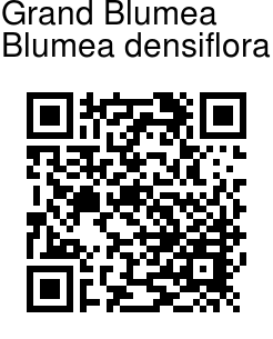 Grand Blumea is a herb or undershrub, with stems up to 1.8 m tall branched, densely woolly, particularly in younger parts and on inflorescence. Leaves are elliptic-oblong to lanceshaped-oblong, apiculate, entire or pinnately lobed, coarsely toothed, 7-40 x 2-10 cm, woolly on the upper surface, densely downy on the lower, base narrowed into a long winged sometimes appendaged leaf-stalk. Flower-heads are yellow, in large branch-end, compact, leafy panicles, clustered at the ends of branches. Flower-heads are 5-7.5 mm in diameter, stalkless or with a very small flower-cluster-stalk, only up to 5 mm. Involucral bracts are longer than florets, linear, tapering, 1-7 mm long, scarious, velvet-hairy on dorsal surface. Flowers of bisexual florets are yellow, tubular, 3.5-4.5 mm long, 5-lobed; lobes broadly triangular, papillate, velvet-hairy with colietters and multicellular hairs. Flower of female florets are thread-like, 3.5-4.5 mm long, 3 to 4-lobed, hairless. Achenes are broadly oblong, ribbed, velvet-hairy. Pappus is reddish, up to 4 mm long, copious. Grand Blumea is found in the Himalayas, NE-India, Himachal Pradesh, Sikkim, Assam, Bangladesh, Myanmar, New Caledonia, peninsular Malaysia, Cambodia, Laos, Thailand, Vietnam. Flowering: November-April.