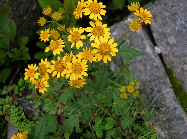 Himalayan Golden Daisy is a tall perennial herb reaching 2 m in height, carrying large cluster of golden daisy-like flowers. Flower-heads are yellow, 1.2-1.8 cm across, in large spreading branch-end corymbs. Ray florets are 10-12, 3-toothed, and the central disk is darker in color. Involucre bracts are 10-12, oblong, acute, often tipped dark brown to black. The plant is hairless below, hairy above, grooved, much branched. Alternately arranged leaves are 15-25 cm long, pinnately divided into toothed lobes, terminal lobe largest, irregularly lobed and toothed, basal lobes stem clasping, upper leaves smaller. achenes 2 mm long, strongly ribbed, pappus white. Himalayan Golden Daisy is found in the Himalayas, Afghanistan to S. Central China and Indo-China, at altitudes of 2400-4000 m. Flowering: August-September.