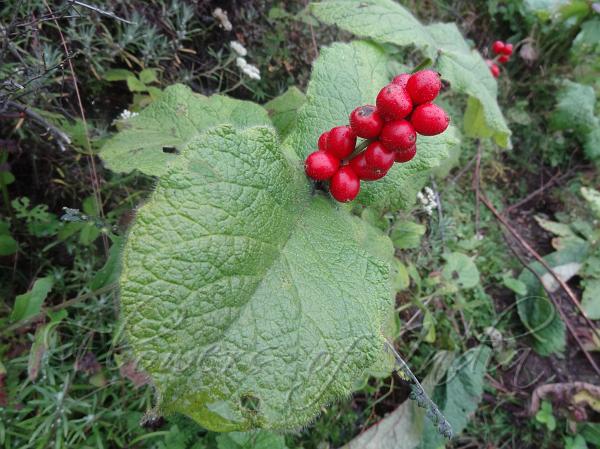 oblong. Fruit is red, marble-like, 1.0-1.2 cm in diameter, crowned with