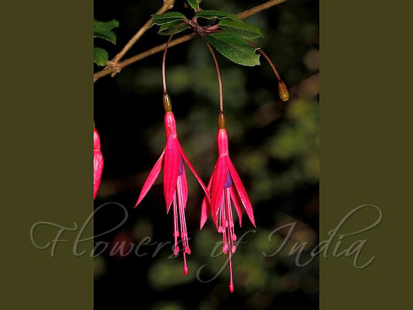 pendent flowers, in brilliant shades of red and purple, softer shades