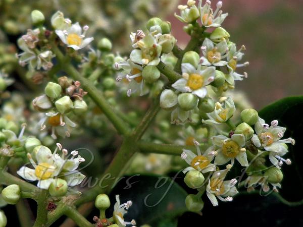 netveined, prominent. Flowers are bisexual, 3-4 mm across, cream
