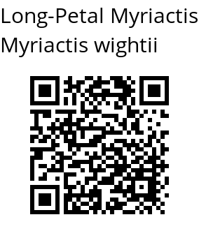 Long-Petal Myriactis is an annual herb, 20-90 cm tall. Flower-heads are few or numerous in terminal, lax clusters carried on 0.4-5 cm long stalks. They have a large yellow center, with small white ray-floret on the periphery. Flower-head cup is hemispheric, about 1.2 cm in diameter in fruit. Phyllaries are 2- or 3-seriate, narrowly oblong to lanceolate, Ray florets are in 2-series, tube about 0.4 mm, lamina linear, 0.8-1 × 0.1-0.2 mm, tip blunt, sometimes 2-lobed. Disk florets limb is bellshaped 0.8-1 mm, 5-lobed. Leaves are often with axillary branches or fascicled. Lower leaves are ovate, or sometimes lyrate-pinnately lobed, terminal lobe ovate. Middle stem petiole is broadly winged, blade broadly to narrowly ovate, 5-8 x 3-6 cm, hairy, base stem-clasping, margin deeply toothed, entire in uppermost leaves. Seed-pods are greenish to pale brown, 1.5-2.5 mm. Long-Petal Myriactis is found in forests on slopes, grasslands, streamsides, in the Himalayas, at altitudes of 1900-3600 m. Flowering: July-November.