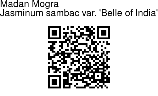 Common name: Arabian Jasmine 'Belle of India' • Hindi: Madan mogra मदन मोगरा • Kannada: ಏಳುಸುತ್ತಿನ ಮಲ್ಲಿಗೆ Elu suttina mallige, ಕೋಲುಮಲ್ಲಿಗೆ Kolu mallige, ಗುಂಡುಮಲ್ಲಿಗೆ Gundu mallige • Nepali: बेली फूल Bhelee Phool, मल्लिका Mallikaa • Tamil: குஂதூ மல்லீ Gundu Malli • Telugu: పందిరి మల్లి Pandiri malli