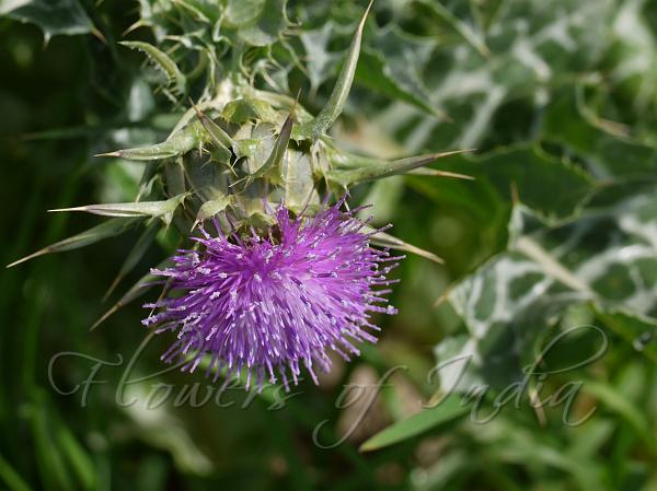 is a fairly typical thistle with red to purple flowers and shiny pale