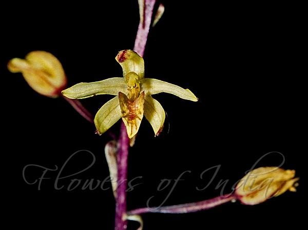 Mountain Pauper Orchid is a large to giant sized, hot to cool growing, terrestrial orchid with a basally thick and fleshy, erect stem enveloped by several short sheaths. The plant is leafless when blooming. Flowers are wide open, borne in a loosely many flowered, 30 cm tall, raceme with oblong-ligulate, floral bracts. Flowers are yellow, 3 x 1 cm; dorsal sepal 13 x 4 mm, oblong, blunt; lateral sepals 11 x 3 mm, oblong, blunt; petals 11 x 3 mm, oblong, blunt; lip 9 x 5 mm, ovate, pointed, 3-lobed, side lobes obliquely ovate-blunt; midlobe ovate, pointed. Mountain Pauper Orchid is found in Indo-Malesia, South India. It is laso found in the eastern Himalayas, NE India, Bhutan, at elevations of 500-1700 m.