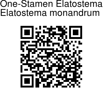 One-Stamen Elatostema is a herb 5-20 cm tall, with separate male and female plants. Stems are ascending or erect, usually simple, hairy, covered with flaky scales. Leaves are usually opposite, hairless or becoming hairless; nanophylls elliptic to lanceshaped, 2-6 mm; stipules obscure; leaf-stalk 1-2 mm, Leaf blade is obliquely wedge-shaped, obliquely elliptic, or lanceshaped, 0.8-4 × 0.4-1.2 cm, herbaceous or membranous, major basal lateral veins both arising at base of leaf blade, cystoliths conspicuous, sparse or present only along margins; base obliquely wedge-shaped, margin toothed or pinnatifid, tip pointed to tapering. Male inflorescences solitary, simple, 1.5-2 mm in diameter; flower-cluster-stalk 0-1 mm; receptacle obscure; bracts fused, 2-2.5 mm; bracteoles lanceshaped to linear. Female inflorescences solitary, 2-5 mm in diameter, stalkless; receptacle small; bracts broadly ovate; bracteoles spoon-shaped-linear. Male flowers 4-merous. Achenes ellipsoid, 6-ribbed. One-Stamen Elatostema is found in the Himalayas, from Himachal Pradesh to Bhutan, Western Ghats, Ceylon, Burma, Indo-China, W. China, at altitudes of 800-3000 m. Flowering: June-October.