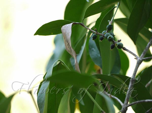 Pear-Fruited Discospermum is a middle-sized tree with ovate-elliptic leaves. Flowers are small, stalkless, in leaf axils. Stamens protrude out. Fruit is pear-shaped with a circular ring below the top.