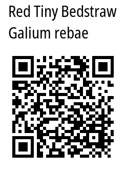 Red Tiny Bedstraw is a spreading to prostrate perennial herb, with stems 13-40 cm or more, weak, hairless, unarmed; internodes 0.7-3.2 cm. Flowers are reddish purple or crimson, 1.95-3.2 mm across, petals ovate, 0.8-1.5 x 0.5-0.9 mm, the point at tip very short or absent. Anthers are pale yellow or yellowish orange. Style united for about 0.3 mm, bifid at tip. Flowers are borne in leaf-axils, in 2-4 flowered cymes; flower-cluster-stalks shorter to longer than the subtending leaf; flower-stalks 0.1-3.2 mm, unequal. Leaves are arranged in whorls of 6, stalkless, narrowly lanceshaped, linear lanceshaped or uppermost narrowly ovate inverted-lanceshaped; those of main branches 5.2-10.2 x 0.6-1.4 mm, 5.9-10 x as long as broad; tip pointed, terminating in a short awn; surfaces hairless, venation penniverved. Mericarps (immature) are about 0.7 x 0.5 mm, blackish, finely verruculose, without hooks. Red Tiny Bedstraw is found from Himalayas to S. Central China, at altitudes of 2000-4000 m.