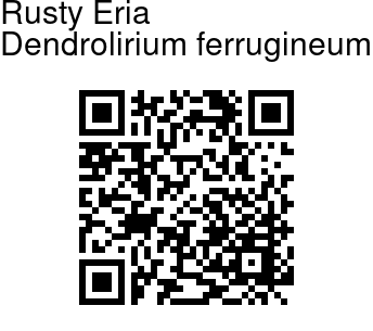 Rusty Eria is a small sized, tree-dwelling orchid with a thick creeping rhizome giving rise to stem-like, cylindric, 5 noded, branched pseudobulbs enveloped by sheaths and carrying 2, apical, narrowly oblong-elliptic to elliptic, pointed to somewhat tapering, leathery leaves, gradually narrowing below into the grooved, stalked base. The plant blooms in the spring on a basal, racemose, woolly, up to 16 cm long, laxly 5 to 10 flowered inflorescence enveloped by lanceshaped, tapering, woolly sheaths and has ovate, pointed, reflexed, woolly floral bracts. Flowers are 2-3 cm across, white, with a pink lip. Rusty Eria is found in NE India and Bhutan at elevations of 800-1800 m.