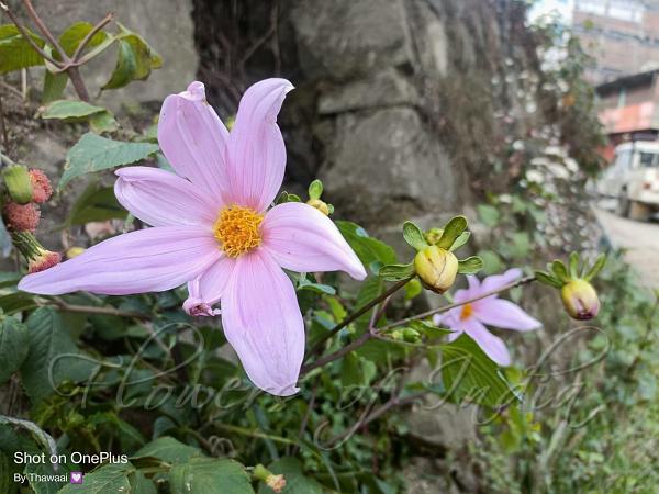 The delicate tree dahlia bears huge leaves and shaggy lavender flowers with