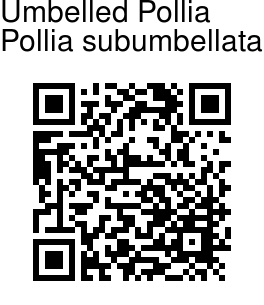 Umbelled Pollia is a perennial herb with stems erect or ascending, 20-30 cm x 3-5 mm, sparsely finely velvet-hairy. Leaves are mostly clustered at tip of stems; leaf sheath 0.5-2.5 cm, sparsely finely velvet-hairy, mouth fringed with hairs; leaf-stalk 1-2.5 cm; leaf blade elliptic to narrowly ovate, 8-15 x 3-6 cm, hairless above, hairless or finely velvet-hairy below. Inflorescence is much shorter than leaves; flower-cluster-stalk extremely short or absent, finely velvet-hairy; cincinni numerous, not in whorls, about 3 cm, finely velvet-hairy; involucral bracts small, less than 1 cm, finely velvet-hairy; bracts membranous. Flower-stalks are straight or arcuate, about 4 mm in fruit. Sepals are ovate-round, shallowly boat-shaped, about 3 mm, persistent. Petals are blue, white, or greenish yellow, ovate-round, about 2 mm. Stamens are 6; fertile stamens 3; staminodes 3, with shorter filaments. Fruits are spherical, 4-5 mm in diameter. Umbelled Pollia is fund in ravine forests, up to altitudes of 1400 m, in Bhutan, NE India, Sikkim. Flowering: June-July.