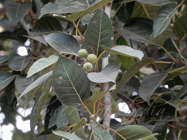 Common name: White Fig • Hindi: पिलखन Pilkhan, पाखड़ Pakhad, पाकड़ Pakad • Manipuri: ꯆꯤꯡ ꯍꯩꯕꯣꯡ Ching Heibong • Marathi: Bassari, Gandhaumbara • Tamil: Kurugatti • Malayalam: ചെരാലാ Cherala • Nepali: काब्रो Kaabro • Telugu: Badijuvvi, Jatti • Kannada: Kari-basari, juvvi • Gujarati: પેપરી Pepri • Sanskrit: प्लक्षः Plaksha, जटी Jatee, पर्कटी Parkatee • Mizo: Zai-hri