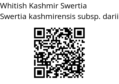 Whitish Kashmir Swertia is a newly (2024) described species which is named in the honor of Prof. G. H. Dar for his significant contribution to the flora of Kashmir Himalaya. It resembles with Swertia kashmirensis in few characters such as nature of rhizome, habit, shape of basal leaves, shape of sepal-cup and nectaries and fruit type. However, it differs in having basal leaves with tips pointed (vs. tips blunt in S. kashmirensis), open flower diameter 1.8-2 cm (vs. 2.2-2.3 cm), sepals 6-8 x 1.6-2.3 mm, (vs. 8-10 x 3-4 mm), petals 6-7.8 x 3-3.7 mm, elliptic-oblong, white with prominent linear bluish nectar guides above and purplish with dull whitish margins below, tips blunt with an apical notch (vs. 10-10.5 x 4-4.5 mm, ovate, yellowish with less prominent nectar guides, tips blunt without an apical notch), nectaries 1.3-1.7 x 0.8-1 mm (vs. 1.2-1.3 x 0.5-0.7 mm), fimbriae 0.5-1 mm long, upright and inverted (vs. 2-3 mm long, inverted), stamens 3.5-4.5 mm long (vs. 6-7 mm long), anthers ovate, sub- dorsifixed, tips apiculate (vs. obovate, dorsifixed, tips blunt), carpel 3-6 x 1.5-3 mm, ovoid (vs. 6-7 x 2-3 mm, ellipsoid), capsule ellipsoid (vs. spherical), seeds 1.5-1.6 x 1-1.2 mm, brownish, round, wings 0.2-0.7 mm wide (vs. 3.5-3.7 x 2.5-3.5 mm, blackish, round-oblong, wings 0.8-1.2 mm wide). Whitish Kashmir Swertia is native to Kashmir. Flowering: August-September.
