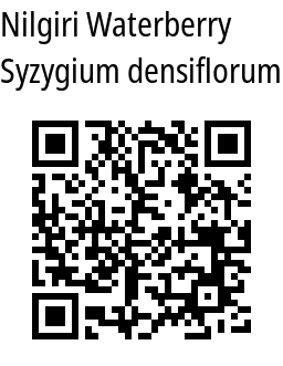 Nilgiri Waterberry is an evergreen tree, up to 20 m tall, bark surface blackish-grey, rough; branchlets round. Leaves are simple, opposite, leaf-stalk 0.3-2 cm long, slender, grooved above, hairless; blade 3.5-9 x 1.8-3.7 cm, elliptic, elliptic-lanceshaped or elliptic-oblong, base narrowed or pointed, tip tapering or with a tail, margin entire, hairless, glandular dotted, leathery, olive-green when dry; lateral nerves many, parallel, close, prominent, looped at the margin forming intramarginal nerve, intercostae netveined, prominent. Flowers are bisexual, creamy, 1-1.2 cm long, stalkless, in dense clusters forming compact, branch-end trichotomous cymes. Sepal-tube is up to 5 mm, top-shaped; sepals 4; no thick disc, petals free, falling off, stamens many, free, bent inwards at the middle in bud; ovary inferior, 2-celled, ovules many; style 1; stigma simple. Fruit is a berry, oblong-ovoid, dark purple, fleshy. Nilgiri Waterberry is endemic to Southern Western Ghats.