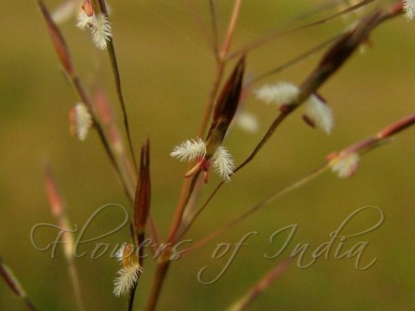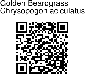 leafy shoots. Its flowering stems are about 20 to 60 cm high and its leaves are linear-lanceolate and about 3 to 10 cm long by 4 to 6 cm wide. The panicles are purplish, open and with few whorled branches and can reach about 5 cm long, bearing few-flowered spikes. The stalkless spikelet is very narrow, about 3 mm long. The callus is elongated and barbed and the fourth glume is linear, acuminate, and awned. Golden Beardgrass is
