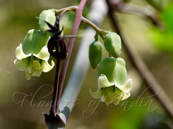large, greenish, bell-shaped with petals curled back. Fruit is green