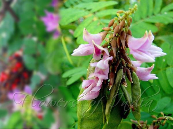 The flowers, shaped like pea flowers, are small, pale, violet to pink